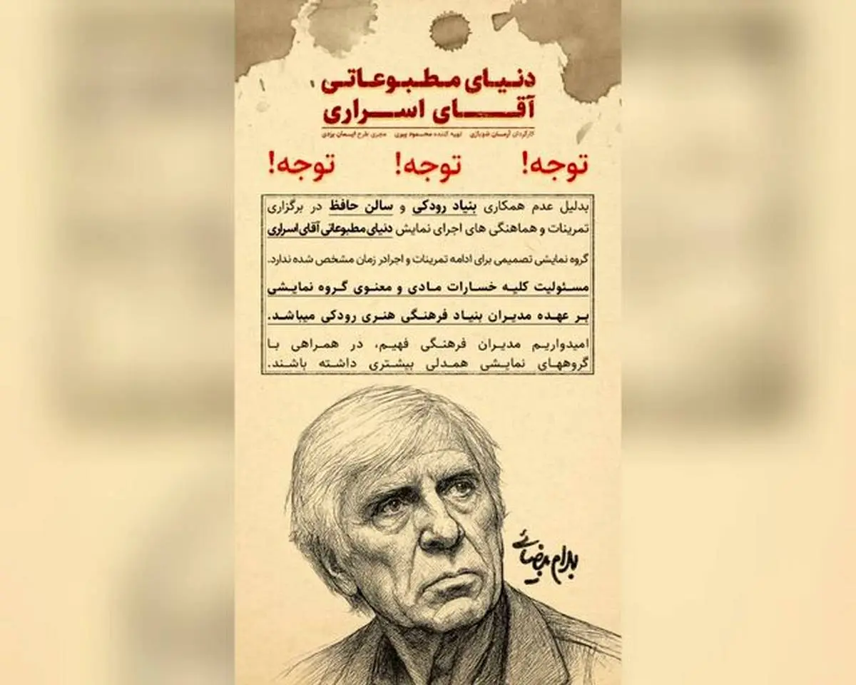 مجری طرح نمایش دنیای مطبوعاتی آقای اسراری اعلام کرد که اجرای این نمایش در تالار حافظ منتفی است.