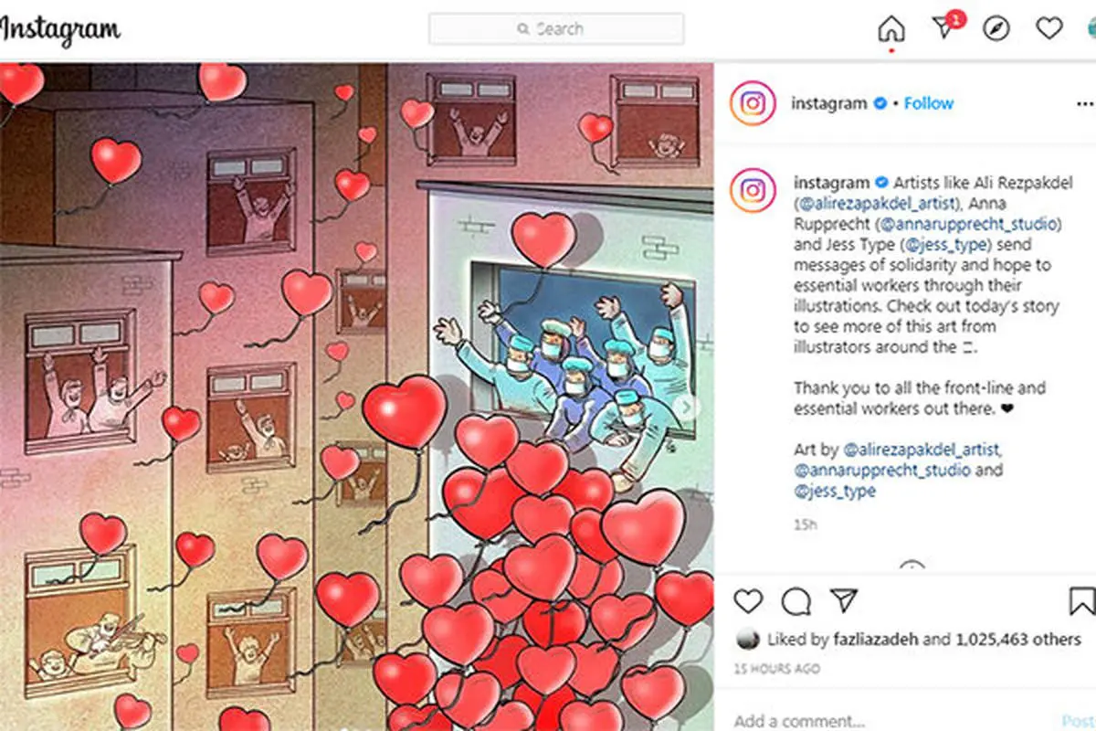 پس از بازتاب جهانی کارتونهای علیرضا پاکدل هنرمند جوان با محوریت «مبارزه با بیماری کرونا»، «مبارزه کادر درمانی با کرونا» و «در خانه بمانیم»، این بار اینستاگرام اقدام به معرفی این هنرمند ایرانی کرده است.