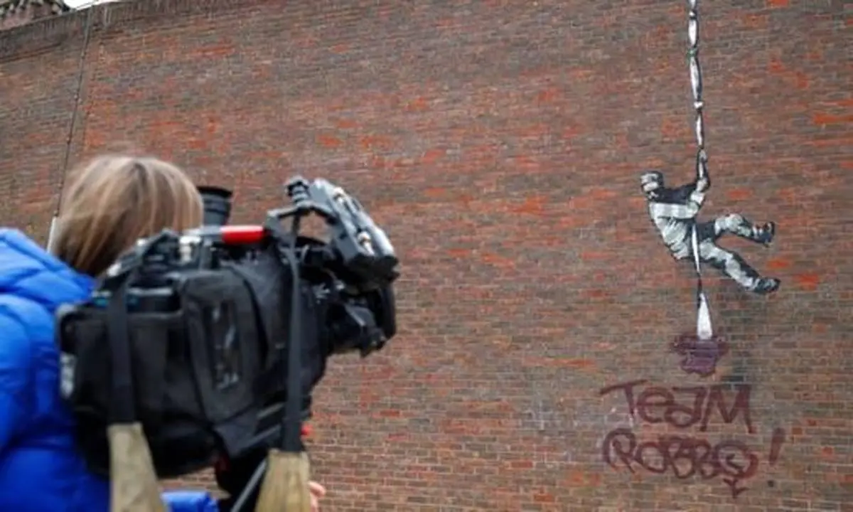 نقاشی دیواری که چندی پیش توسط «بنکسی» نقاش مشهور گرافیتیکار بر روی دیوار زندانی متروکه خلق شده بود و یک زندانی را حین فرار نشان میداد با عبارت قرمز رنگ مخدوش شد.