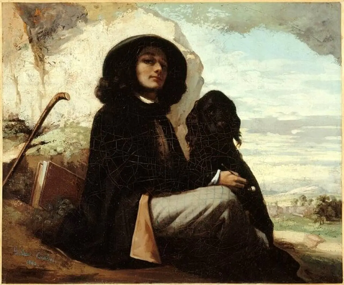 «گوستاو کوربه»(۱۸۱۹–۱۸۷۷) تعداد زیادی خودنگاره، به‌ویژه در اوایل دوران کاری‌اش، زمانی که از آن‌ها برای کاوش سبک‌های مختلف و نمایش خود در چهره‌ها و حالات متفاوت استفاده می‌کرد،‌ کشید. نقاشی «مرد ناامید»(۱۸۴۳–۱۸۴۵) او را تقریبا در حال کندن موهایش نشان می‌دهد،‌ این درحالی است که «خودنگاره با سگ سیاه» یک هنرمند رمانتیک را به تصویر می‌کشد که در حال استراحت با پیپی در دهان، بیرون از شهر و در حال طراحی در طبیعت است. صخره‌ی رنگ‌پریده و سنگی در پشت، حوالی منطقه «Ornans» را نشان می‌دهد که جایی است که پیش از آنکه «کوربه» در سال ۱۸۳۹ میلادی به پاریس نقل مکان کند،‌ در آن بزرگ شد. «کوربه» مرتب به آنجا بازمی‌گشت تا نقاشی کند و این مکان بعدها در بسیاری از آثارش ظاهر شد.