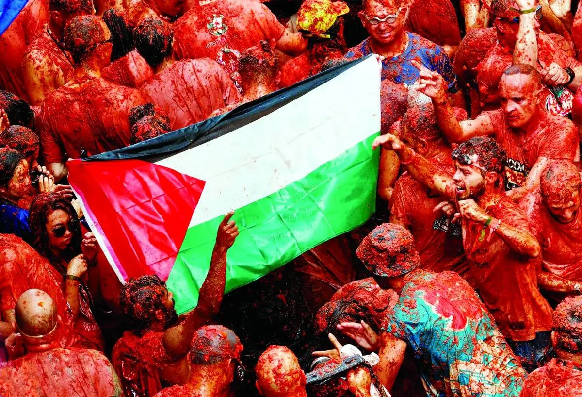 جشنواره غذایی «لا توماتینا» در اسپانیا، یکی از بزرگترین جشنهای جهان است که در آن شرکتکنندگان گوجهفرنگیهای رسیده را بهسوی هم پرتاب میکنند. اما امسال و در ۲۷اوت، وقتی همه با گوجهفرنگی پوشیده شده بودند، پرچم فلسطین را حمل میکردند که مورد توجه جهانیان قرار گرفت.