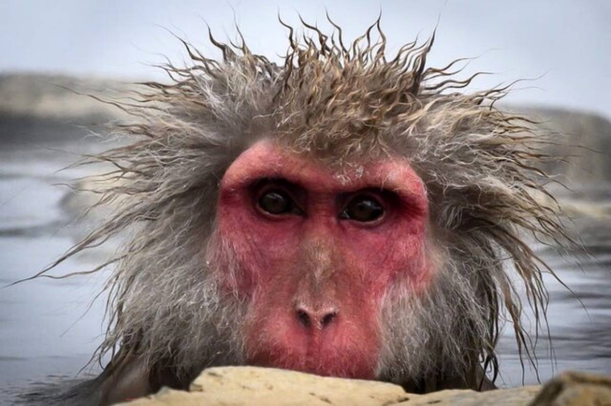 یک میمون برفی که در ماه فوریه در پارک Jigokudani میمون‌ها در ژاپن، در چشمه آب گرم روباز حمام می‌کند.