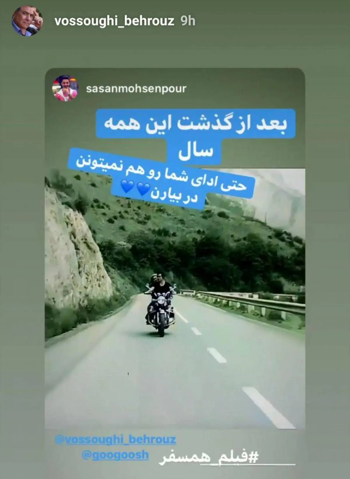 سرنا_ بهروز وثوقی نظر کاربران فضای مجازی، دربارهی ارجاع و ادای دین سریال صداوسیما، بهفیلم "همسفر"ش را استوری کرد: «حتی ادای شما رو هم نمیتونن دربیارن»!