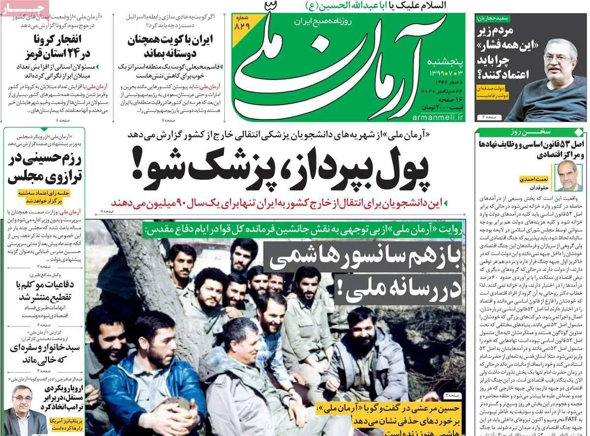 تصاویر صفحه نخست روزنامههای امروز پنجشنبه ۳ مهر ۱۳۹۹