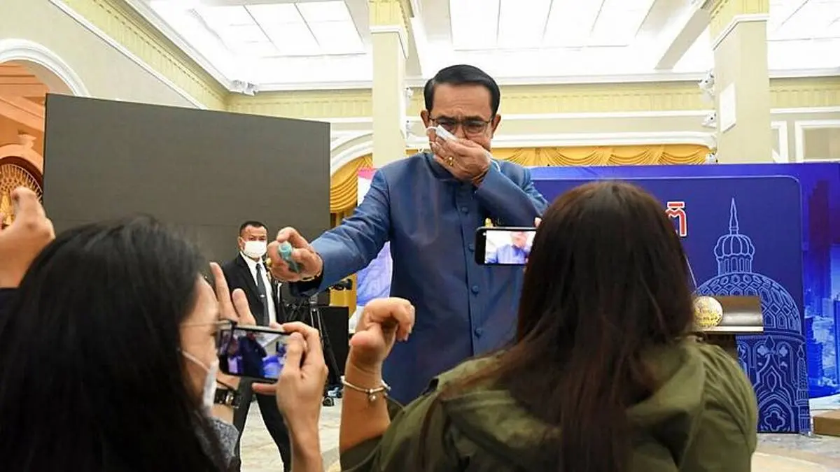 سرنا_پرایوت چان اوچا، نخست وزیر تایلند روز سه شنبه در پایان نشست خبری ضمن خودداری از پاسخ به پرسش خبرنگاران درباره ترمیم کابینه با اسپری به آنها مایع ضدعفونی کننده پاشید.