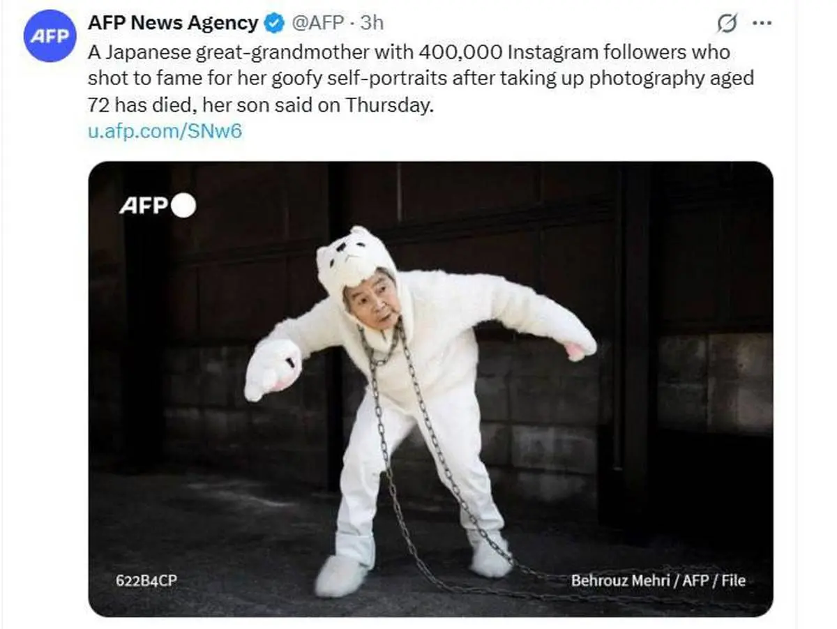 مادربزرگ معروف ژاپنی با ۴۰۰ هزار دنبالکننده در اینستاگرام که پس از شروع عکاسی در سن ۷۲ سالگی به خاطر عکسهای سلفی بامزهاش به شهرت رسید، درگذشت.