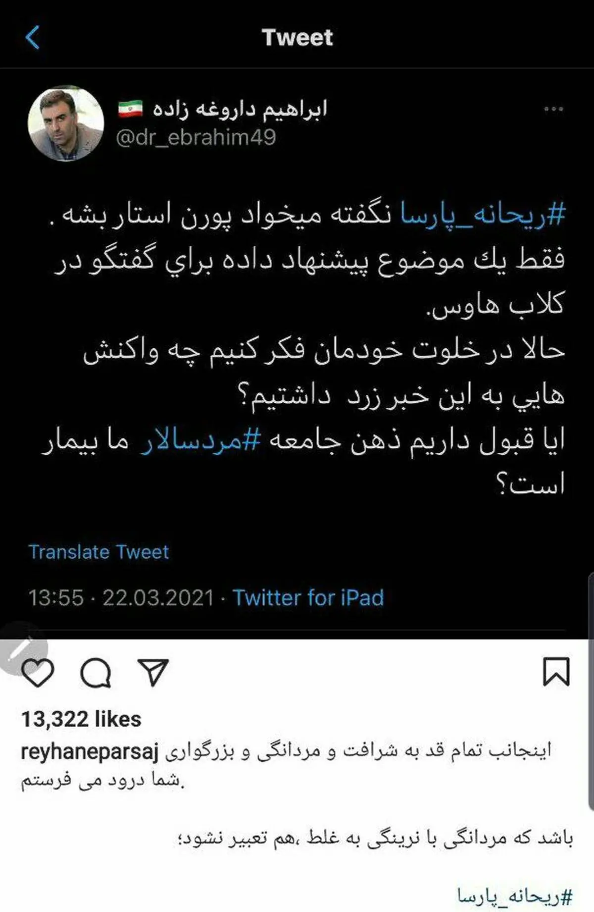 سرنا_ابراهیم داروغه زاده در توئیتی نسبت به حواشی اخیر ریحانه پارسا واکنش نشان داد که واکنشش با ستایش این بازیگر، همراه شد.