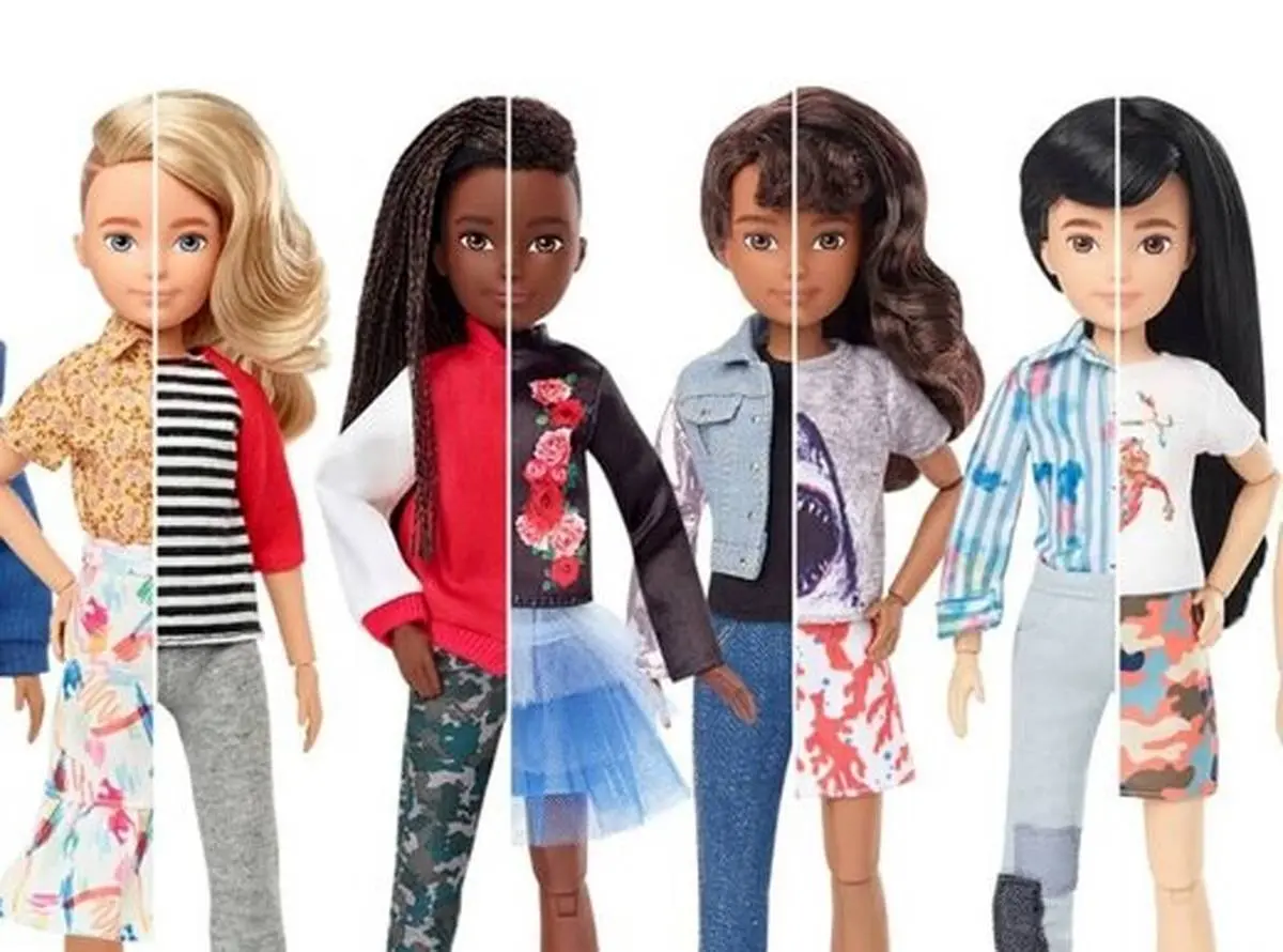 در سال ۲۰۱۹ شرکت ماتل که دنیای عروسک را با تقسیم کردن آن به باربیها و کنهای ایدهآل تسخیر کرده است، سری جدیدی از عروسکهای بدون جنسیت را برای پسران، دختران و سایر جنسیتها معرفی کرد. به گفته کیم کلمون، مدیر اجرایی ماتل، در این سری مذکور، هر عروسک در رنگ پوستهای متفاوت موجود بوده که بههمراه هریک از آنها دو کلاه گیس با طولهای مختلف و مدلموهای متفاوت فر، صاف و بافته شده و همچنین گزینههای متنوع لباس موجود است که به بچهها اجازه میدهد تا استایل عروسک را با موهای کوتاه یا بلند، دامن یا شلوار یا هردو انتخاب کنند. شرکت دیزنی هم در این بین راهی برای سازگاری با والدینی که معتقدند اسباببازیها باید بهصورت جنسیتی به بازار عرضه شوند، پیدا کرده است. در وبسایت دیزنی، خریداران همچنان میتوانند جنسیت اسباببازی را انتخاب کنند، اما تقریباً هیچ تفاوتی در آنچه ظاهر میشود، وجود ندارد.