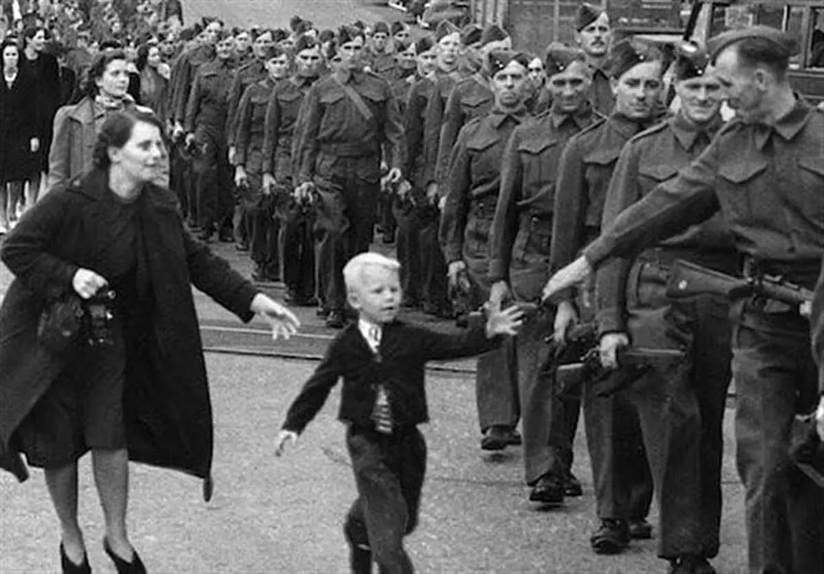 زمانی که دتلوف دوربین خود را برای گرفتن عکس از صف طولانی سربازان برتیش کلمبیا آماده کرده بود به ناگاه میبیند که کودکی پنج سالهای با موهای روشن از مادرش جدا میشود و به سمت پدرش میدود و میگوید: «صبر کن، بابا».