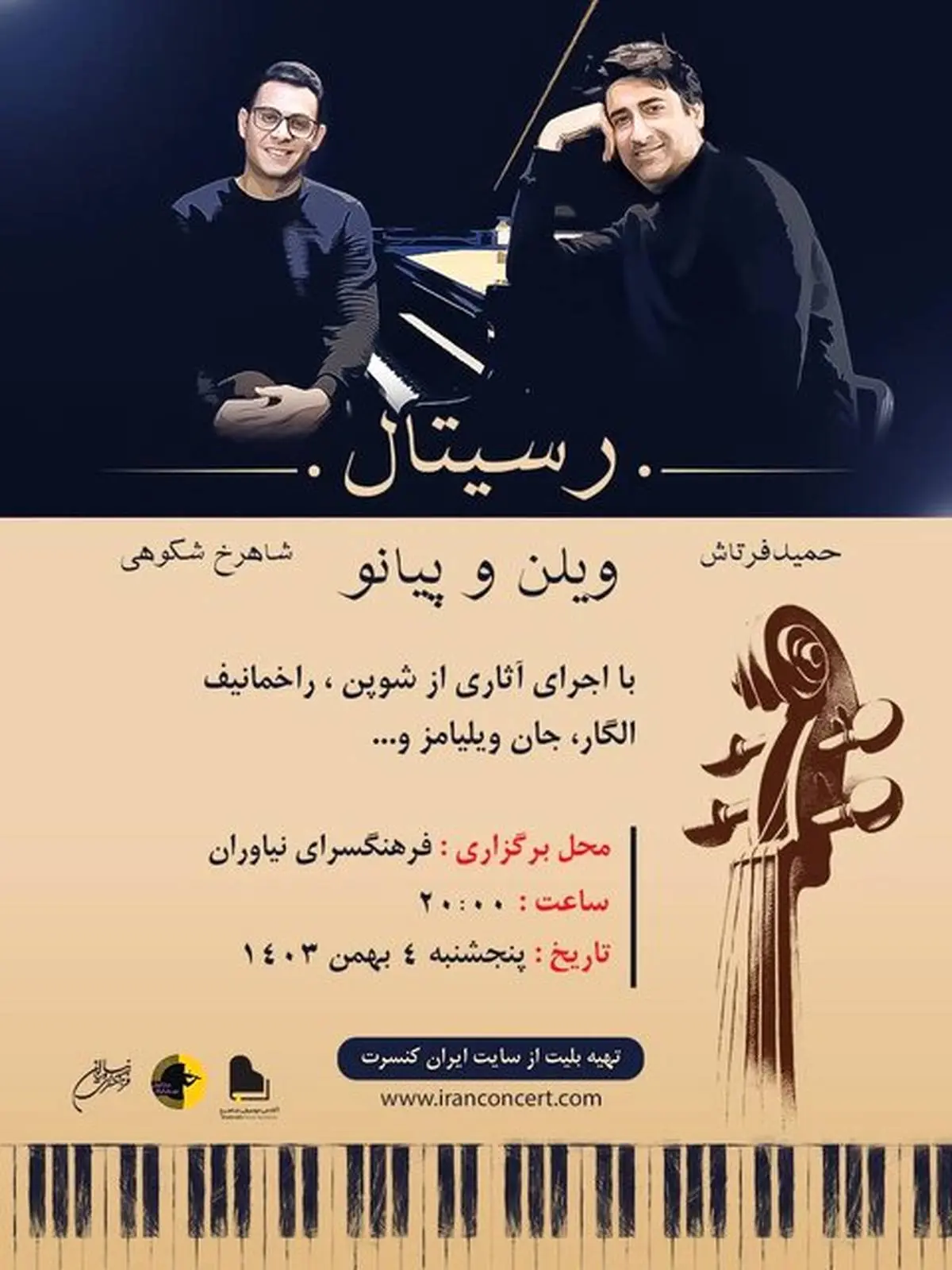 در این کنسرت قطعاتی از راخمانینف، شوپن، جان ویلیامز، برامس و... با دونوازی ویولن و پیانو توسط شاهرخ شکوهی و حمید فرتاش، روز پنجشنبه ۴ بهمن ۱۴۰۳، برای علاقه‌مندان، اجرا خواهد شد.