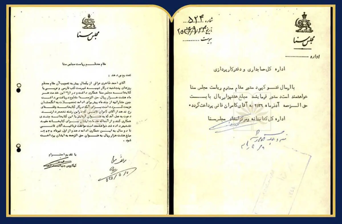 در همین راستا، کیکاوس جهانداری، مدیرکل کتابخانه و مرکز اسناد مجلس سنا، طی مکاتباتی با ریاست مجلس و اداره‌کل حسابداری، ضمن اشاره به خدمات مؤثر فانی، خواستار تداوم همکاری او به مدت دو سال و پرداخت حق‌الزحمه مربوطه شده است. همچنین در یکی از اسناد، مکاتبه‌ای از سوی کامران فانی درباره نحوه واریز و دریافت حقوق ثبت شده است.