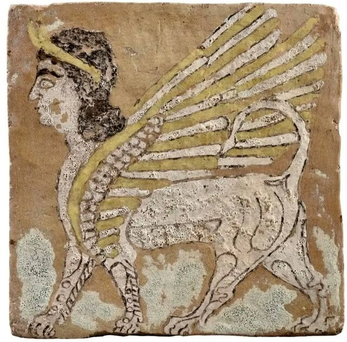 در این آجرها که در سالن نمایشگاهی موزه ملی ایران به نمایش گذاشته شده است، بدن شیر بالدار با سر انسانی (بانو) ترکیب شده و بالهای بلند آن به صورت منظم رو به بالا نشان داده شده است. سر با ابروی کشیده و چشمهای درشت، سربند سنتی و موهایی در پشت گردن جمع شده است که به وضوح یک زن را نشان میدهد.